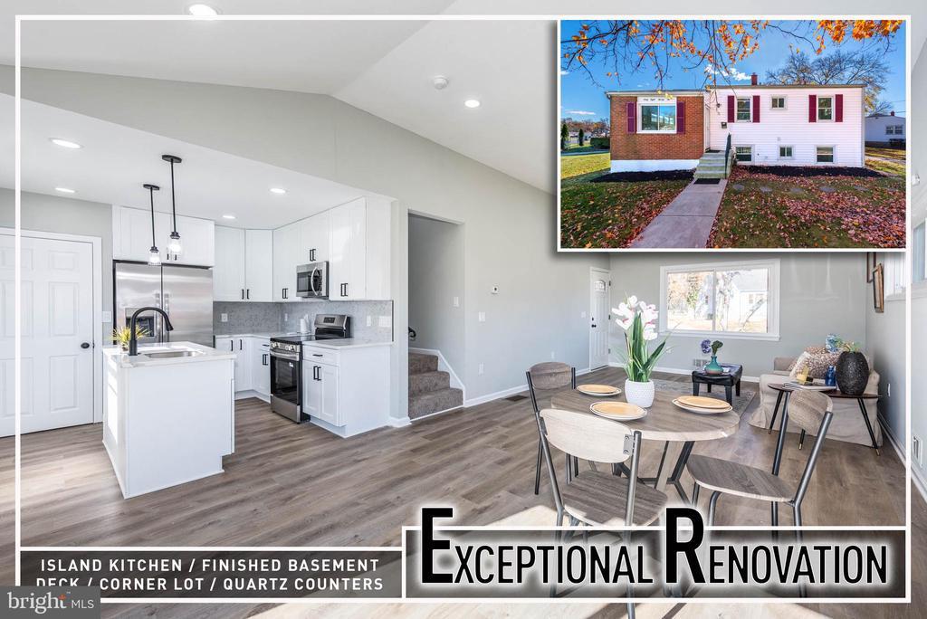Beautifully renovated split-level home situated on a spacious corner lot, offering a bright open layout and modern updates throughout. The main level features an inviting open floor plan with abundant natural light, wood flooring, and a seamless flow between the living room, dining area, and kitchen. The gourmet island kitchen is designed for both functionality and style, complete with Quartz countertops, stainless steel appliances, ample cabinetry, and a large center island that provides additional prep space. The upper level includes three well-sized bedrooms and a remodeled full bath with contemporary finishes. The fully finished lower level provides valuable additional living space, featuring a generous family room suitable for a variety of uses, a 4th bedroom, a second full bath, and a large laundry and storage room for added convenience. Outdoor living is enhanced by a rear deck overlooking a wide, open backyard, offering plenty of space for recreation, gardening, or future outdoor projects. A storage shed and an extended driveway with multiple parking spaces complete the property. Renovated with comfort and practical living in mind, this home is move-in ready and thoughtfully updated.